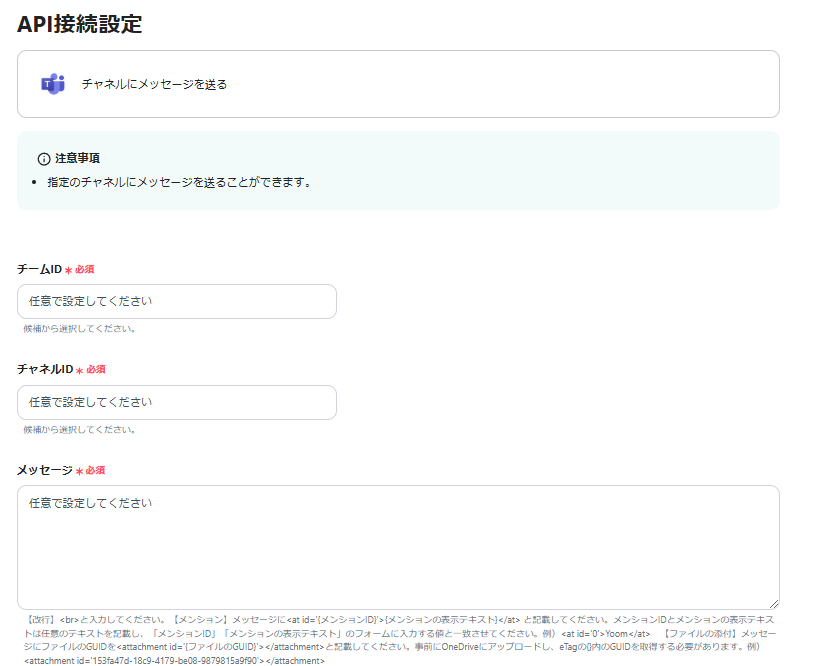 アウトプットを活用し、「チームID」「チャネルID」「メッセージ」を入力しましょう。