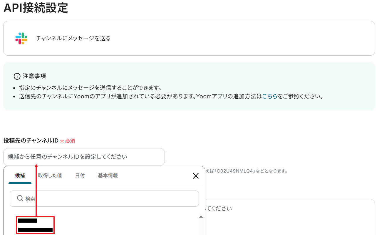 API接続設定に移るので、投稿先のチャンネルIDを候補から選択してください。