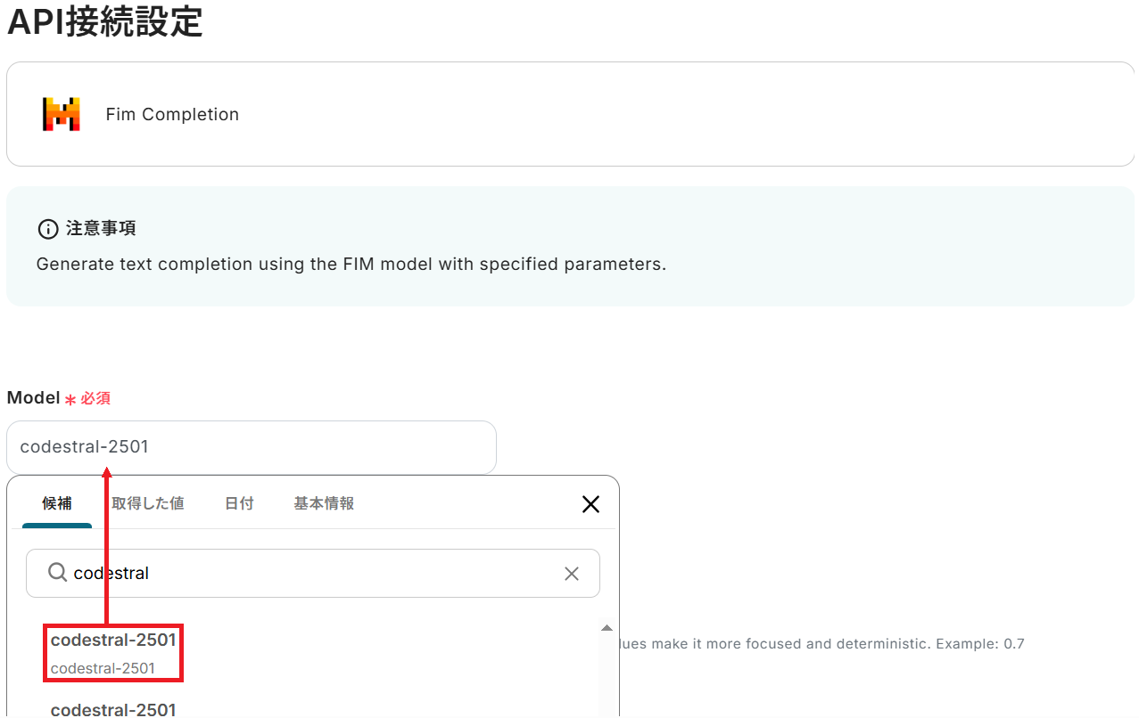 ※Mistral AIはアクションによって使用できるModelが異なります。Fim CompletionでテストできるModel(codestral-2501など)を選択しましょう。