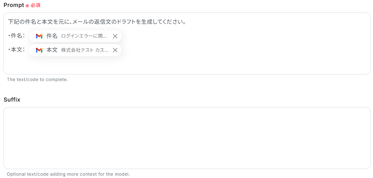 Suffix…Modelに更にコンテキストを追加するためのオプションのテキスト/コード