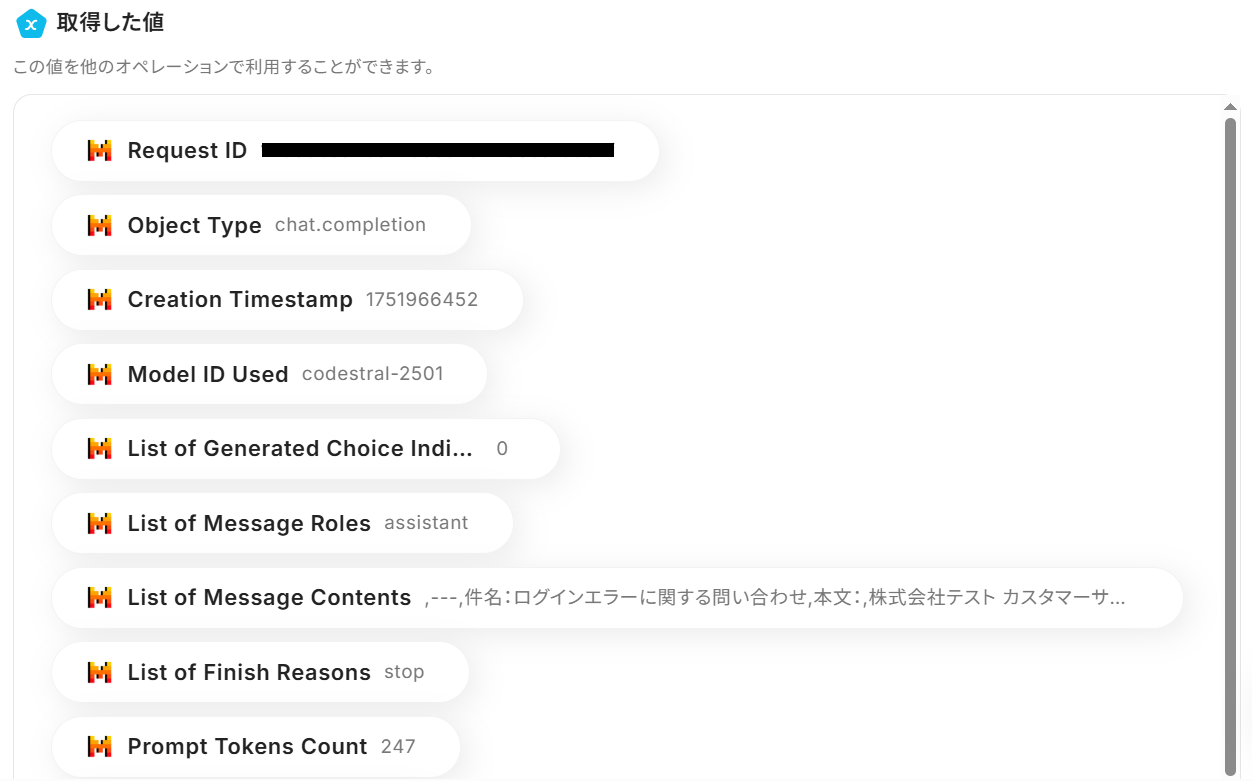 Mistral AI APIのFim Completionアクションをフローの中に組み込むことで、特定の情報をもとに文章の生成や補完を自動化できます。 例えばGmailで受信したメール内容をトリガーとして、その文脈に沿った返信文案をMistral AIに自動で作成させ、ビジネスチャットに通知するといった連携が可能です。