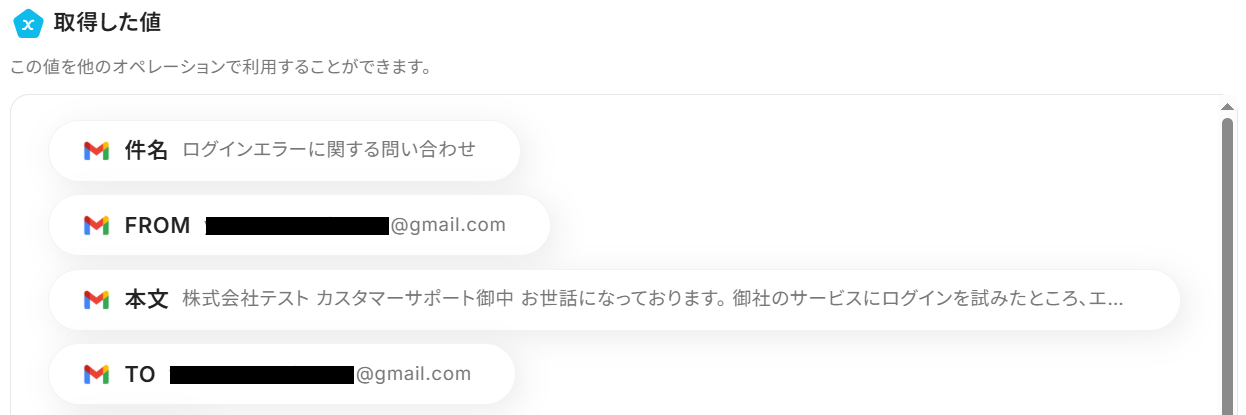 最後に、連携したGmailアドレスに上記のキーワードを含むテストメールを送信しておきましょう。 今回は以下のように、件名に「問い合わせ」というワードが入ったメールを送信しました。