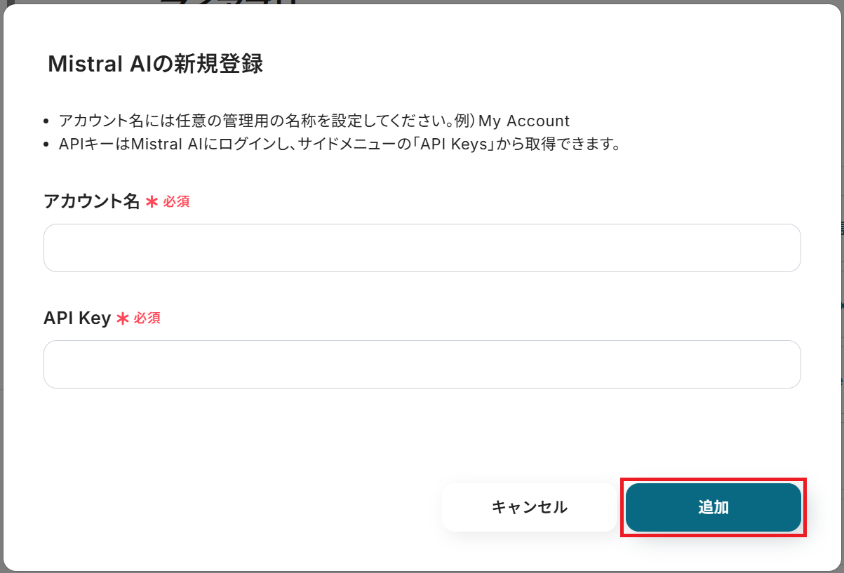 任意のアカウント名と、Mistral AIのサイトから取得したAPI Keyを入力し「追加」をクリックするとマイアプリ連携が完了します。
