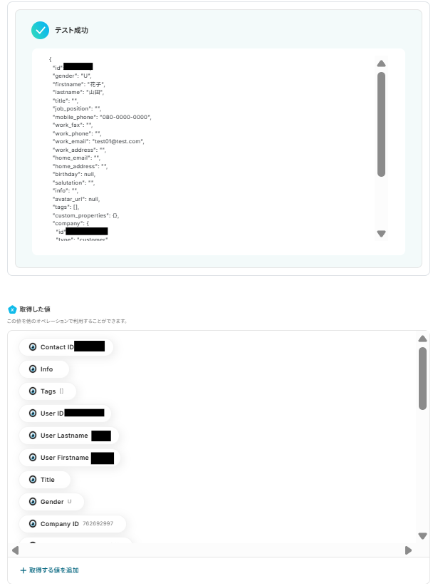 テストが成功すると、取得した値の各項目の横にMOCOで作成した連絡先の詳細情報が表示されます。「保存する」をクリックして完了です!