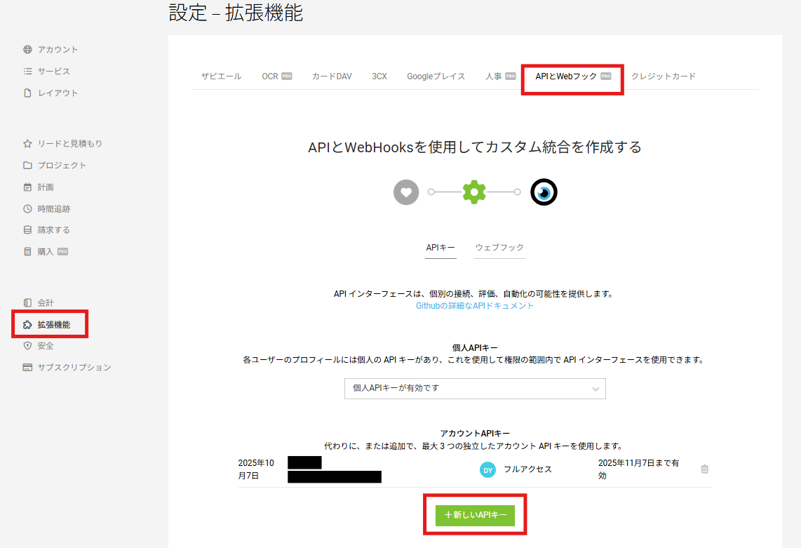 MOCOにログインし、「設定 > 拡張機能 > APIとWebフック」と進み、「+新しいAPIキー」をクリックして作成します。