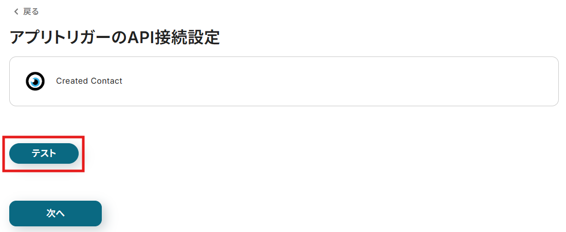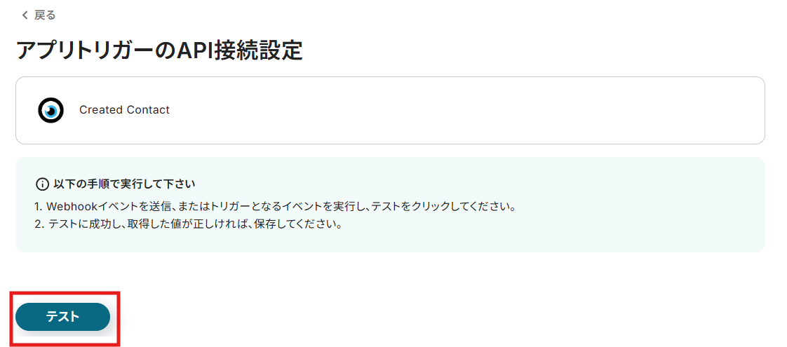新しい連絡先を作成したらYoomの操作画面に戻り、「テスト」をクリックします。