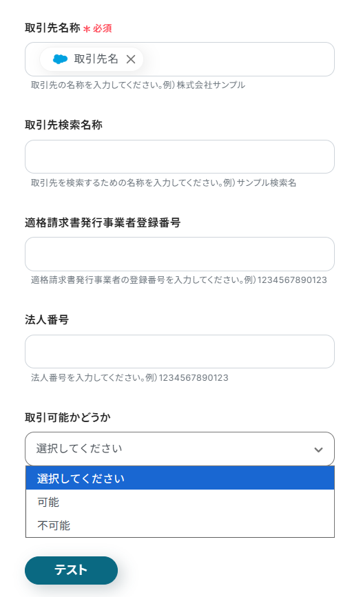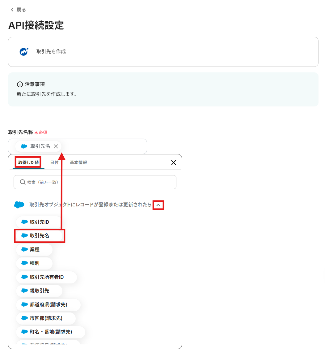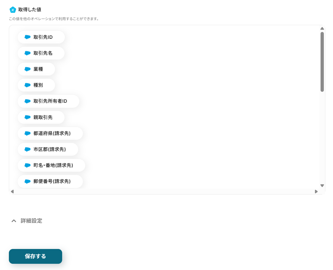 取引先名称など、Salesforceの情報を転記する項目は、取得した値から対応する項目を設定します。