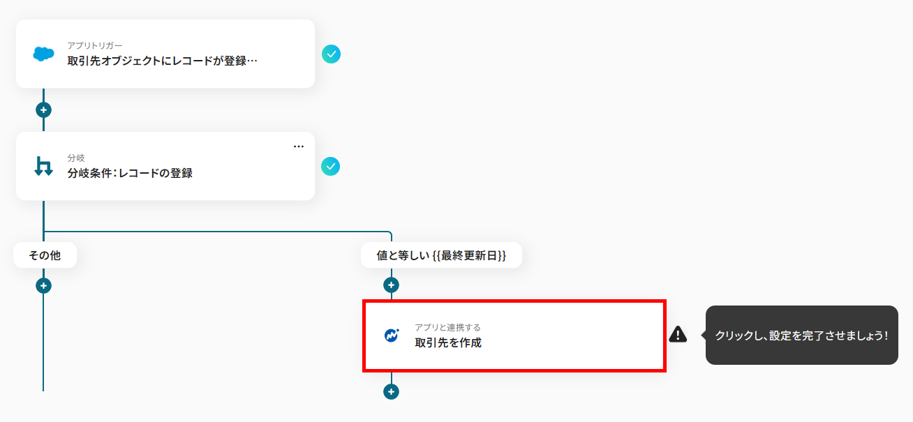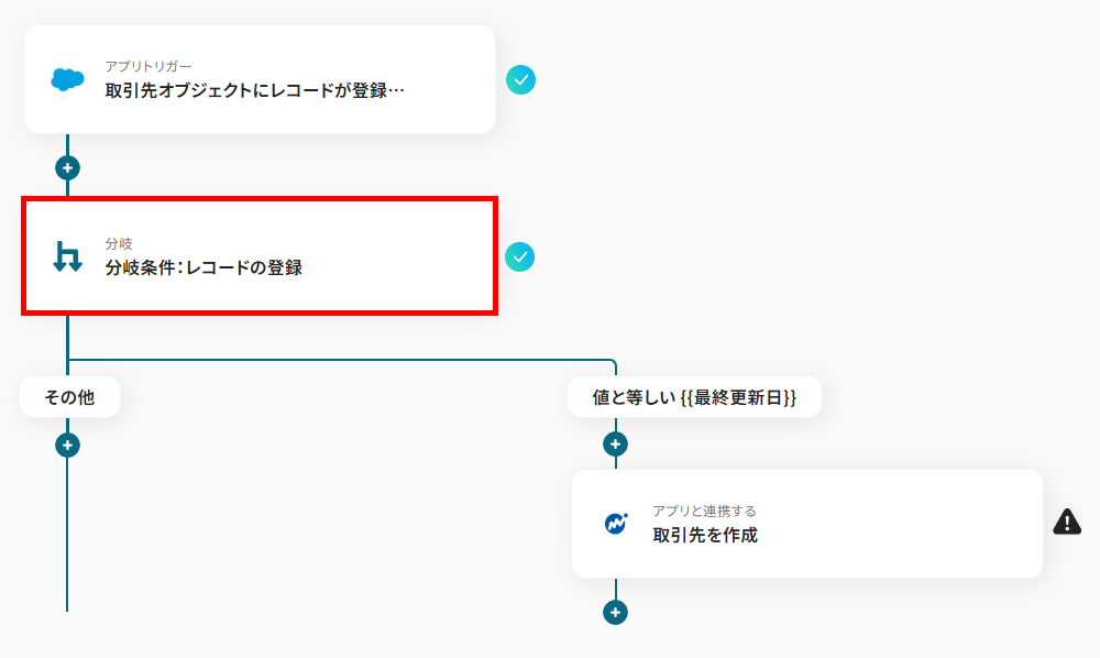 続いて、Salesforceへの取引先の登録か更新かで後続の処理を分岐させる設定を行います。