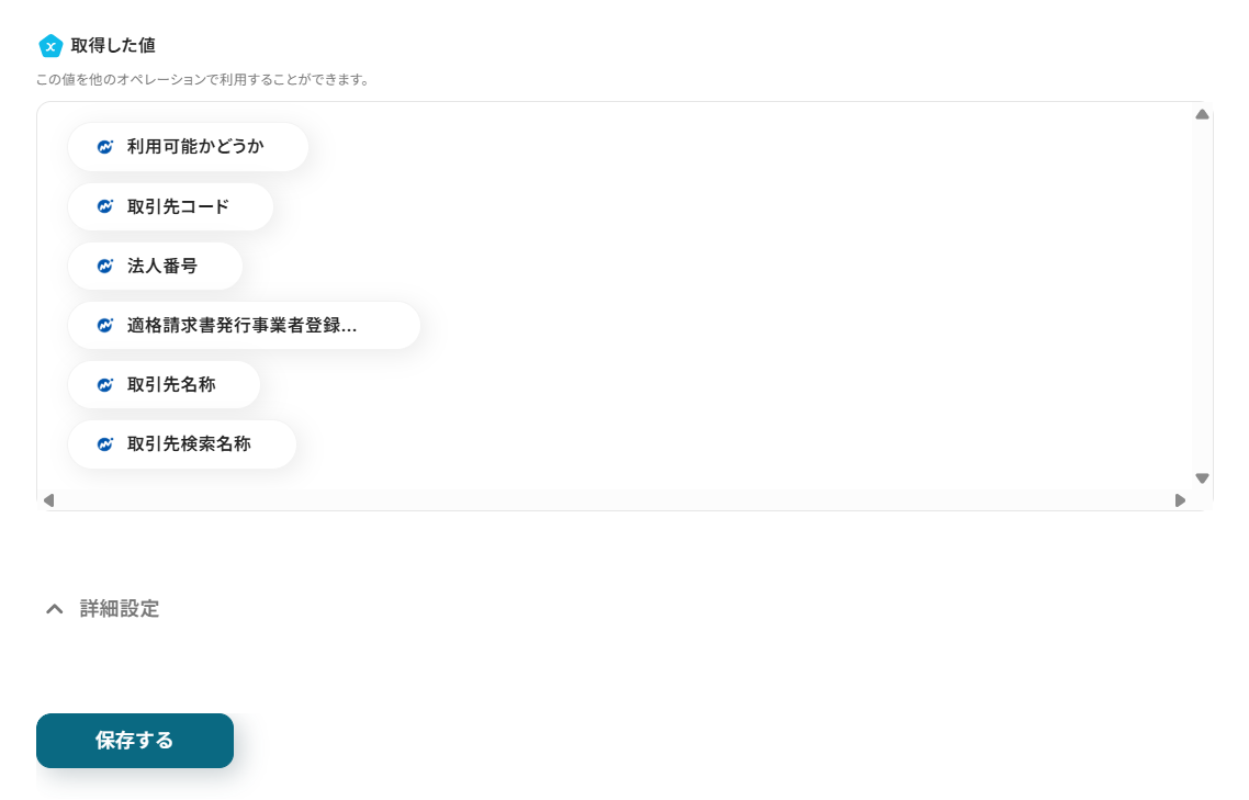 テストが成功すると、登録した取引先情報が取得されるので、確認してから保存します。