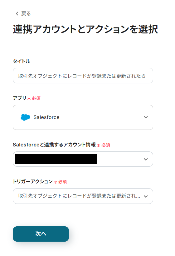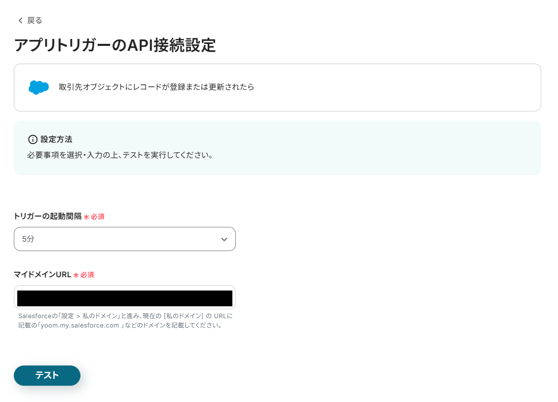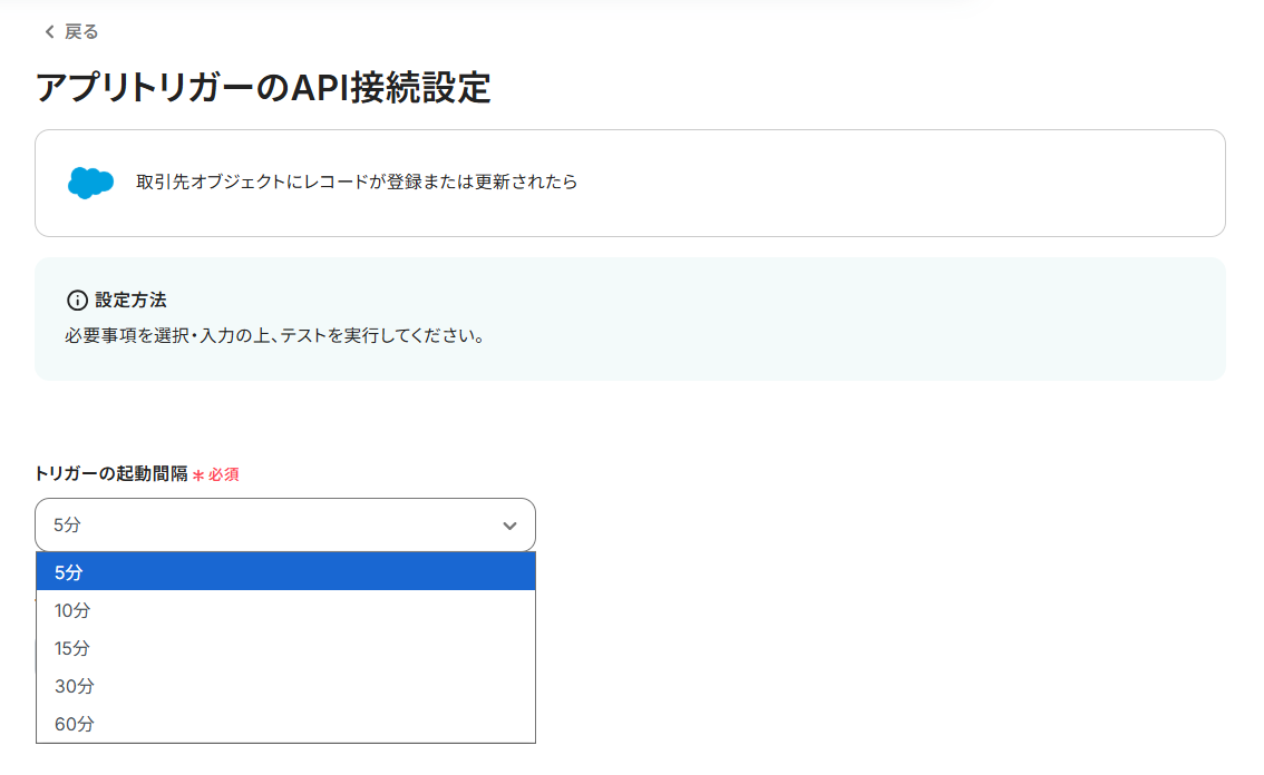 - ここで設定した時間間隔ごとに1度、Salesforceに取引先が登録または更新されたかを確認します。