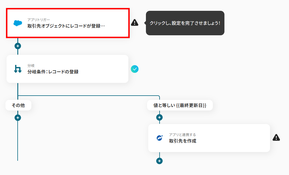 ここでは、Salesforceに取引先が登録されたら、自動化フローが起動するように設定を行います。