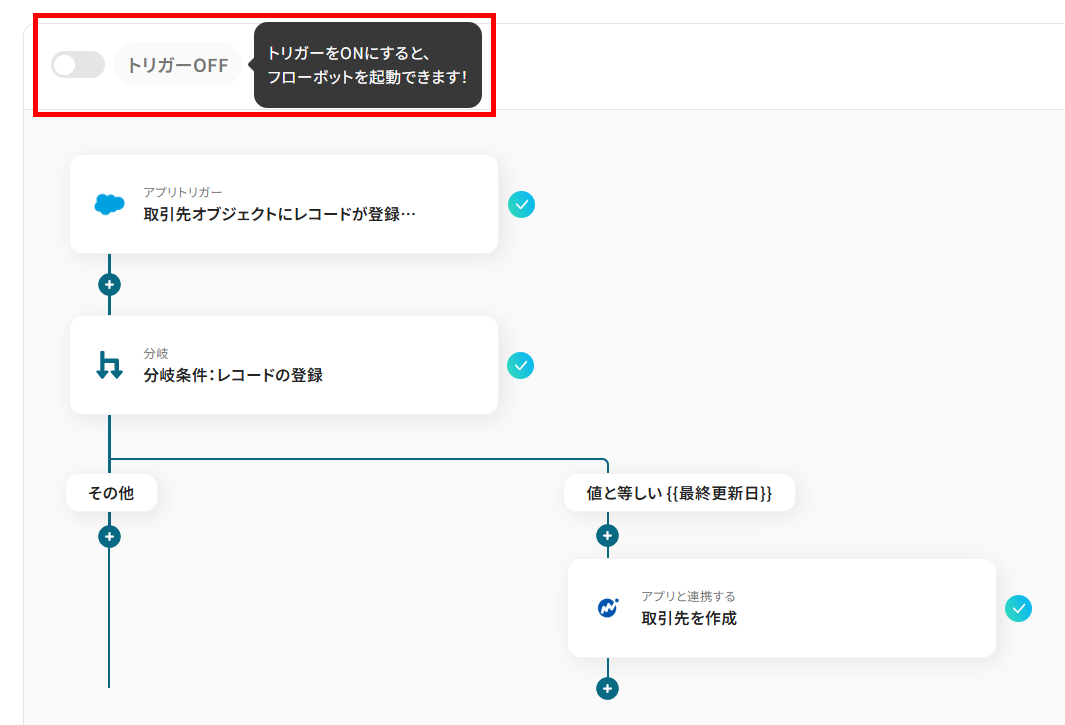 ・Salesforceはチームプラン・サクセスプランでのみご利用いただけるアプリとなっております。フリープラン・ミニプランの場合は設定しているフローボットのオペレーションやデータコネクトはエラーとなりますので、ご注意ください。
