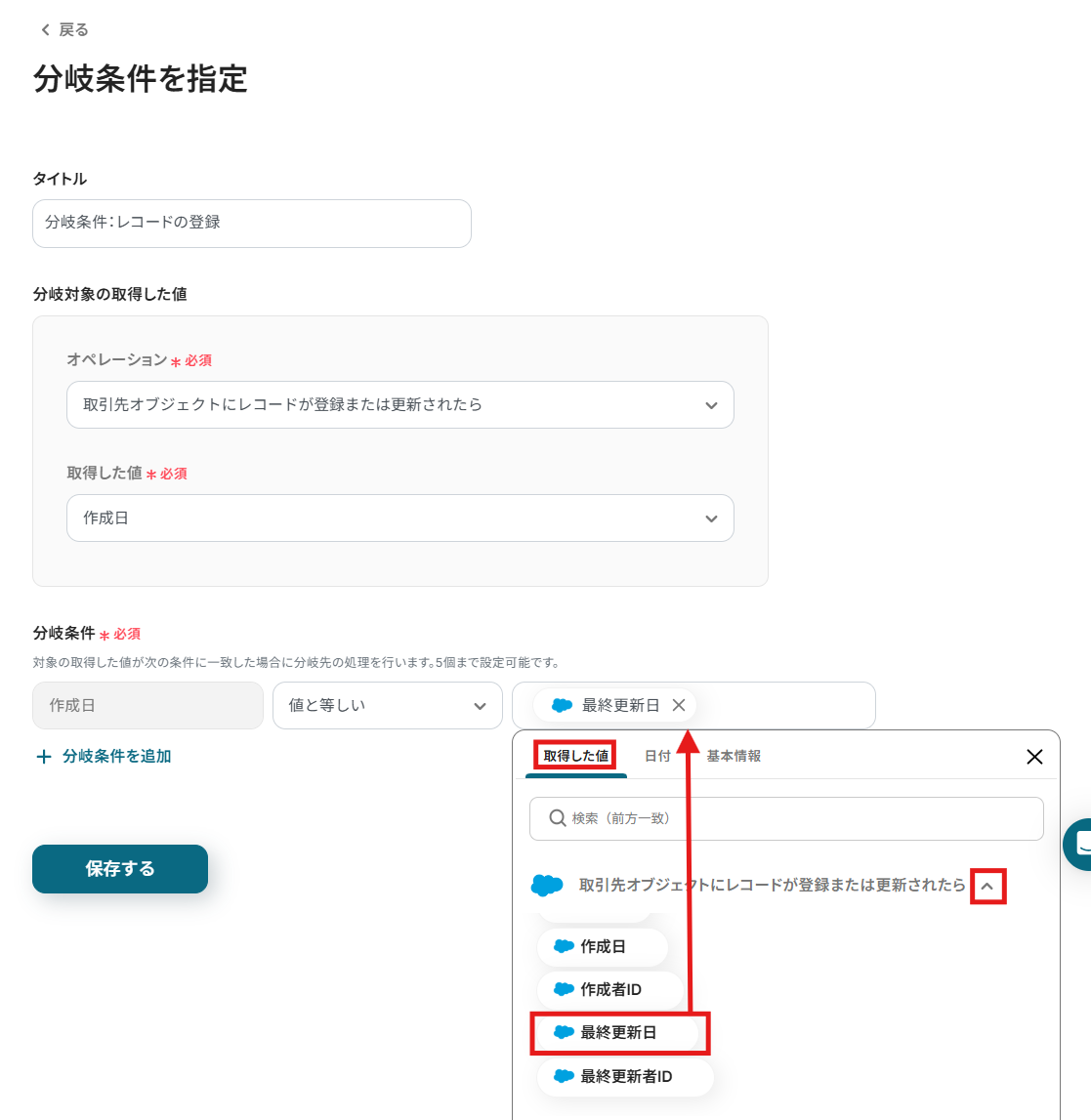 分岐条件の右枠には、取得した値から「最終更新日」を設定することがポイントです。
