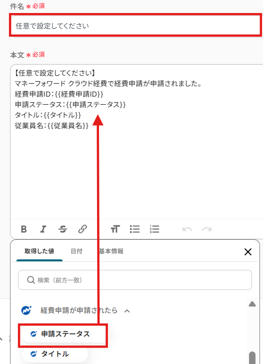 - 「本文」→任意の内容とアウトプットから選択可能です。