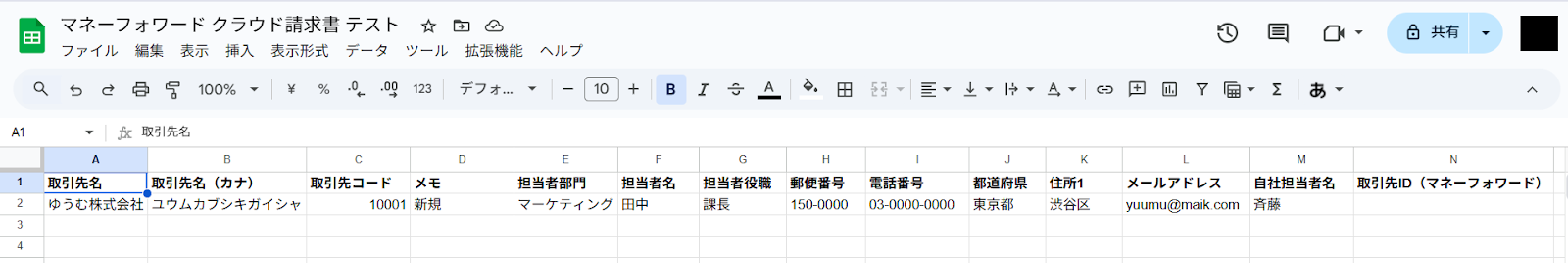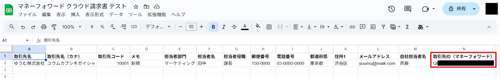 テストが成功すると、マネーフォワード クラウド請求書から取得した取引先IDがGoogle スプレッドシートに追加されるので確認してください。