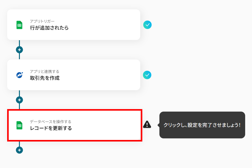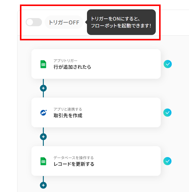 これをフローの中に組み込むことで、CRMやGoogle スプレッドシートに新しい顧客情報が追加された際に、自動でマネーフォワード クラウド請求書にも取引先として登録できます。