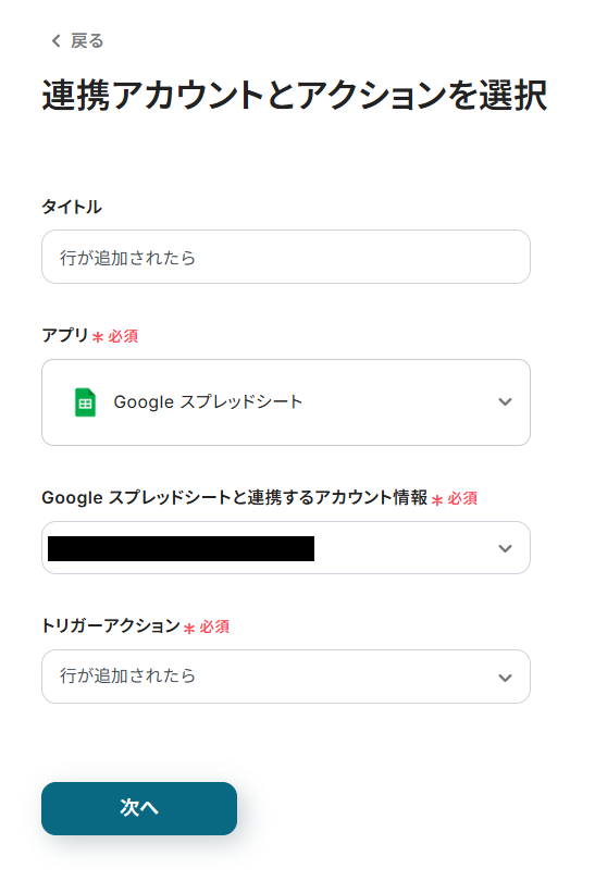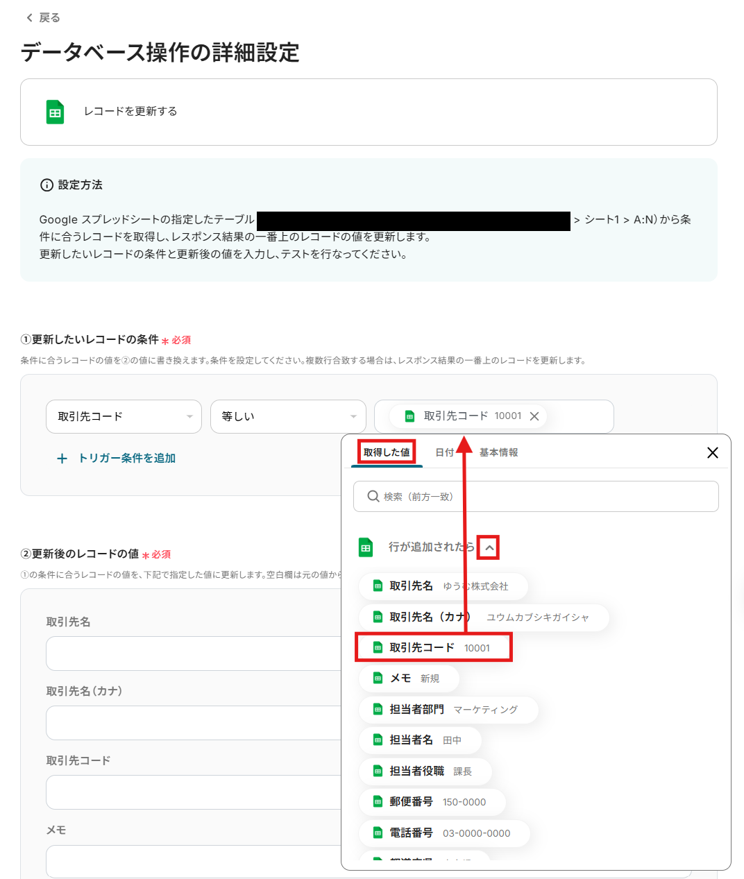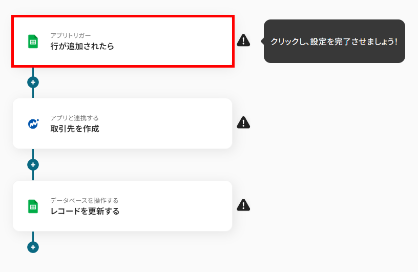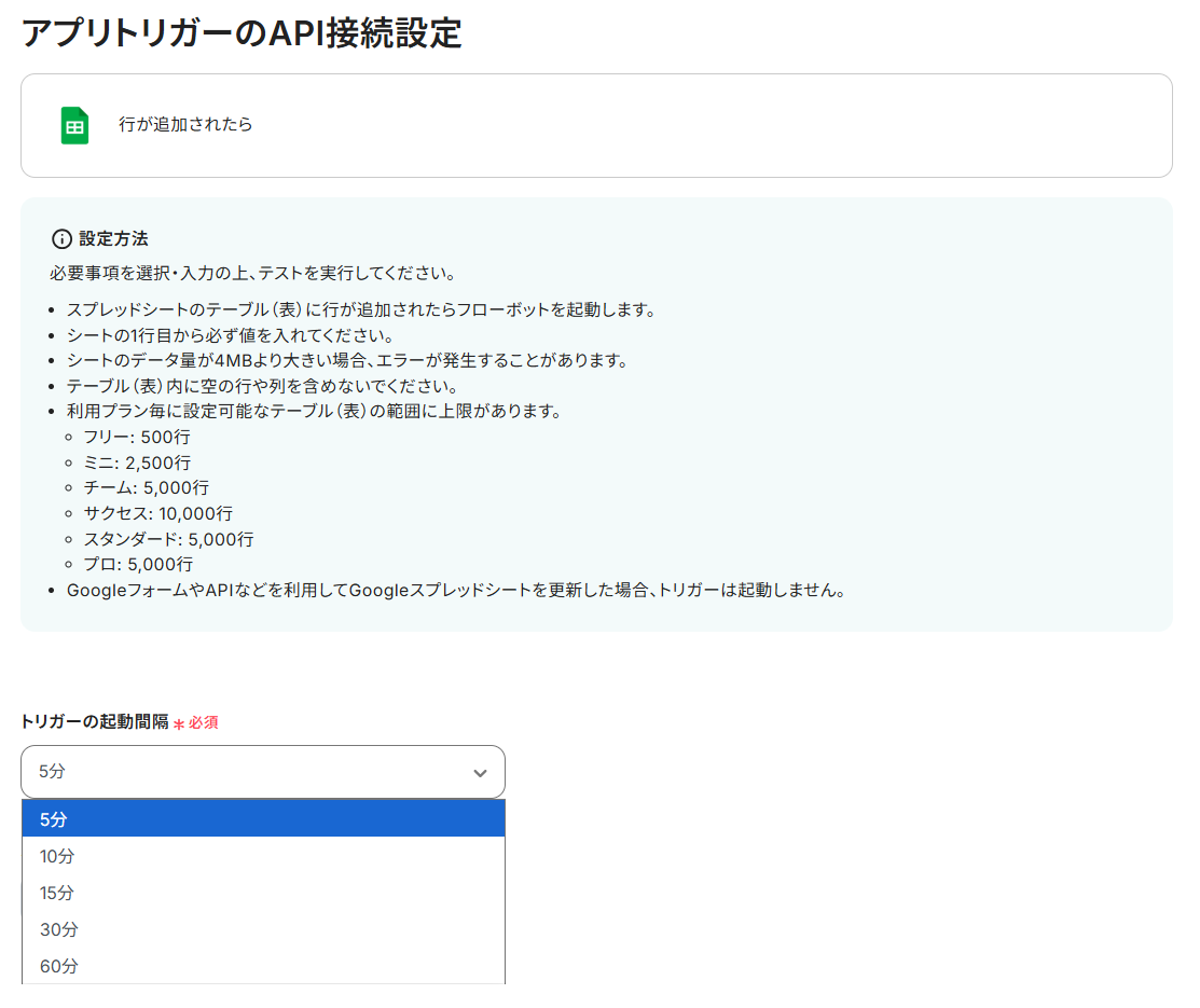 ここでの設定により、Google スプレッドシートに取引先情報が追加されると、フローボットが起動します。