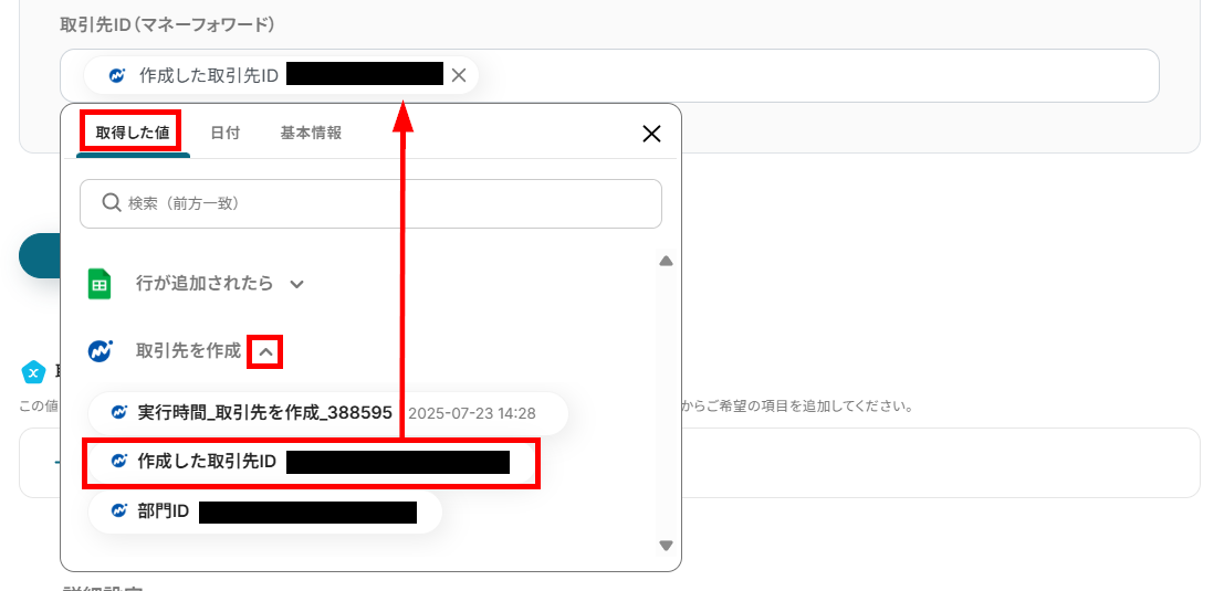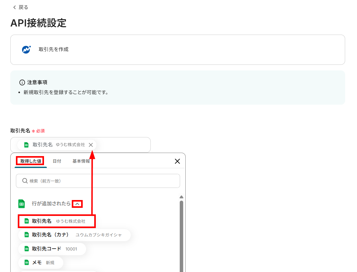 これにより、Google スプレッドシートに追加した取引先情報を変数としてマネーフォワード クラウド請求書へ登録できます。