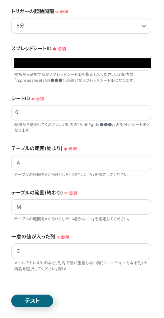 テーブル範囲は、ステップ3で連携したシートを利用するため、以下の値になっています。