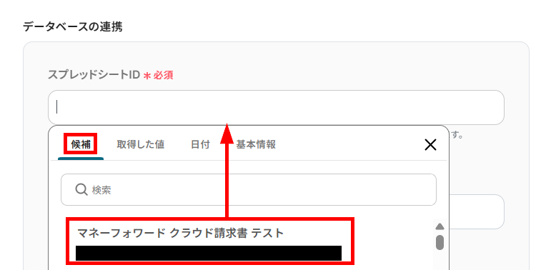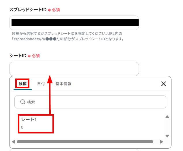 スプレッドシートIDとスプレッドシートのタブ名は、候補から設定できます。