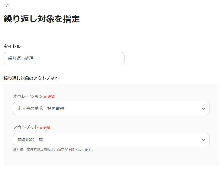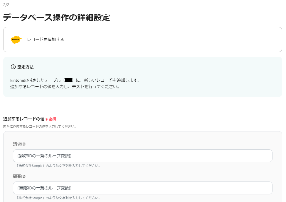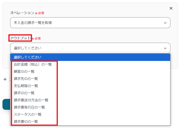 ※ステップ3で取得したアウトプット(取得した値)から、「顧客IDの一覧」「請求IDの一覧」がデフォルト設定されています。さらにkintoneに同期したい項目があれば、「+アウトプットを追加(取得した値を追加)」をクリックして選択してください。