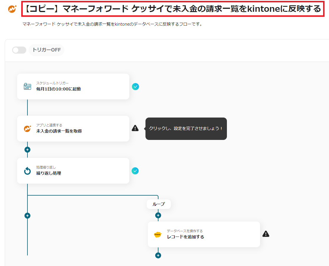 マネーフォワード 掛け払いで未入金の請求一覧をkintoneのデータベースに反映するフローです。
