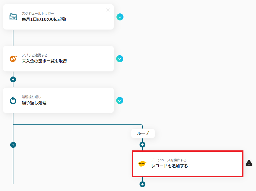 このフローにより、マネーフォワード 掛け払いからのデータ取得とkintoneへのデータ追加が自動化されるため、手作業による転記作業が不要になり入力ミスやデータ不整合のリスクが軽減されて業務効率の改善になります。