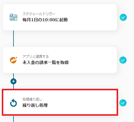 ・「同じ処理を繰り返す」オペレーション間の操作は、チームプラン・サクセスプランでのみご利用いただけるアプリとなっております。フリープラン・ミニプランの場合は設定しているフローボットのオペレーションやデータコネクトはエラーとなりますので、ご注意ください。