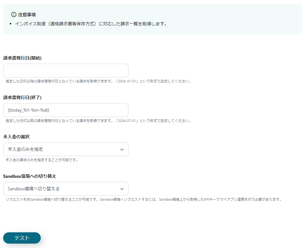 ※請求書発行日は、開始と終了の2点で絞り込むことができます。古い日付のデータが不要な場合は、開始日もアウトプット(取得した値)を用いて設定してください。