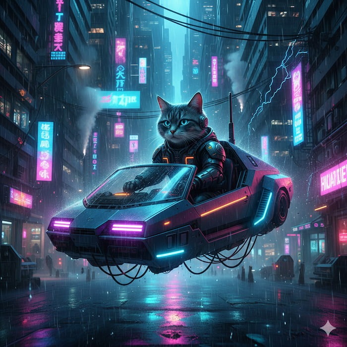 「サイバーパンクな街」「空飛ぶ車」「猫」「雨」という、指定した4つの主要要素がすべて一枚の絵の中に収まりました。紫と青のネオンが雨に濡れた路面に反射する様子や、未来的な車を操縦する猫の姿が、劇的なライティングとともに描写されています。