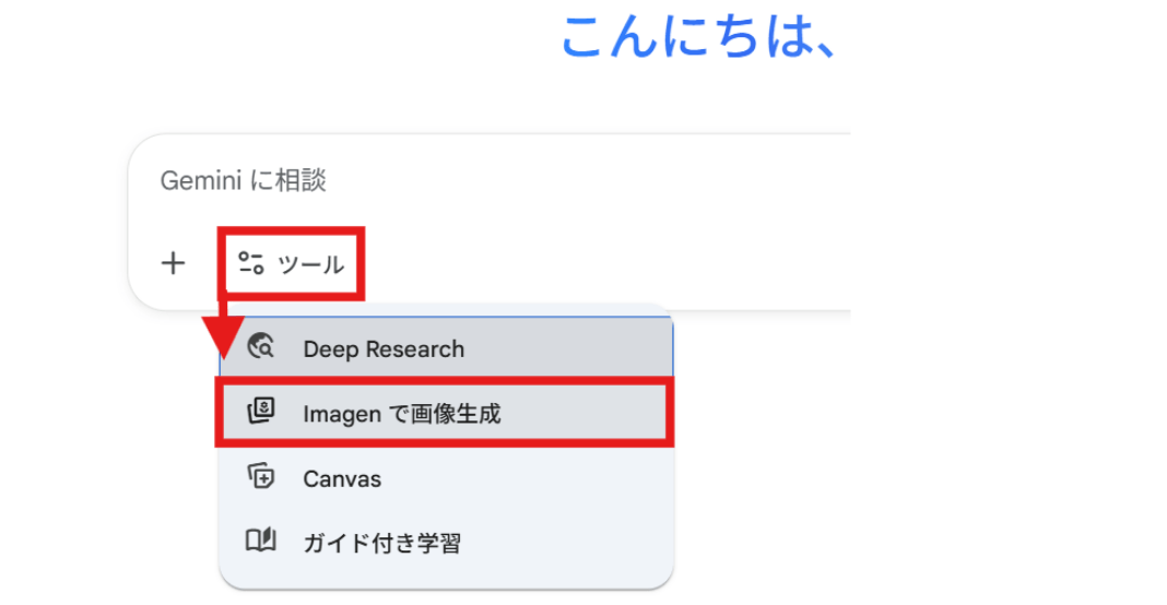 まずはGoogleにログインし、Geminiの画面を開きましょう。次にツールボタンをクリックし、Imagenで画像生成を選択します。