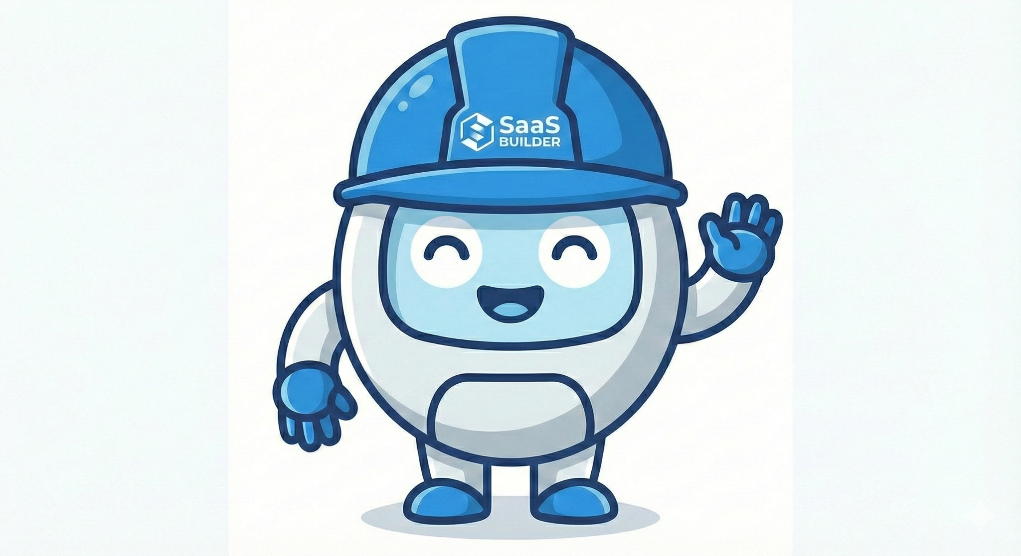 > B2B SaaS企業のブログマスコット。青いヘルメットをかぶった親しみやすいロボット。白背景、正面向き、シンプルでフラットなデザインで。