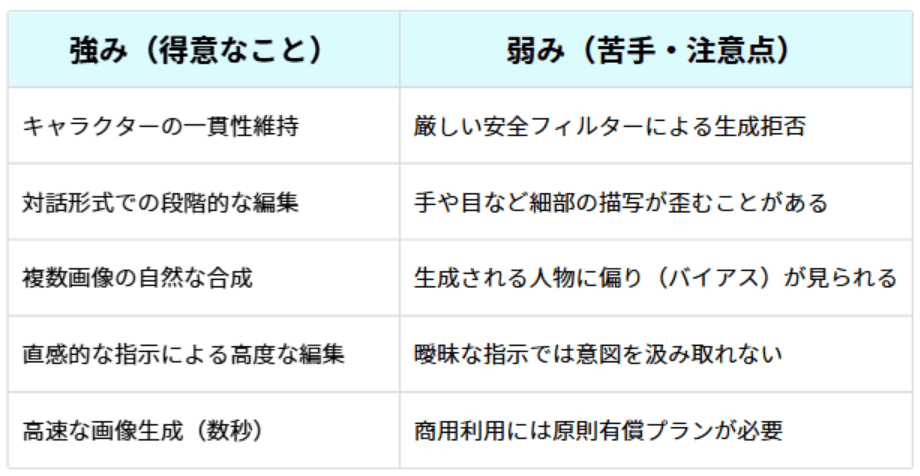 芸術性を追求するMidjourneyや、対話のしやすさを売りにするDALL-E 3に対し、Nano Bananaは「実用的な編集能力」と「キャラクターの一貫性」に強みを持っています。生成して終わりではなく、そこから理想の形に「育てていく」ワークフローに特化しています。