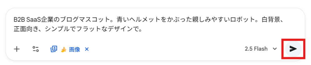 今回は「自社オリジナルキャラクターを作成し、対話型編集でブログ用画像を制作する」という検証なので、まずは私たちの架空SaaS企業のブログマスコットを生成してみます。