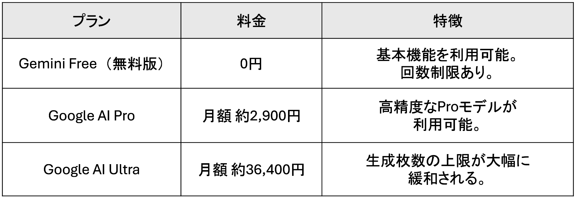 Nano Bananaは無料で使い始めることができますが、用途に合わせてプランを選択しましょう。