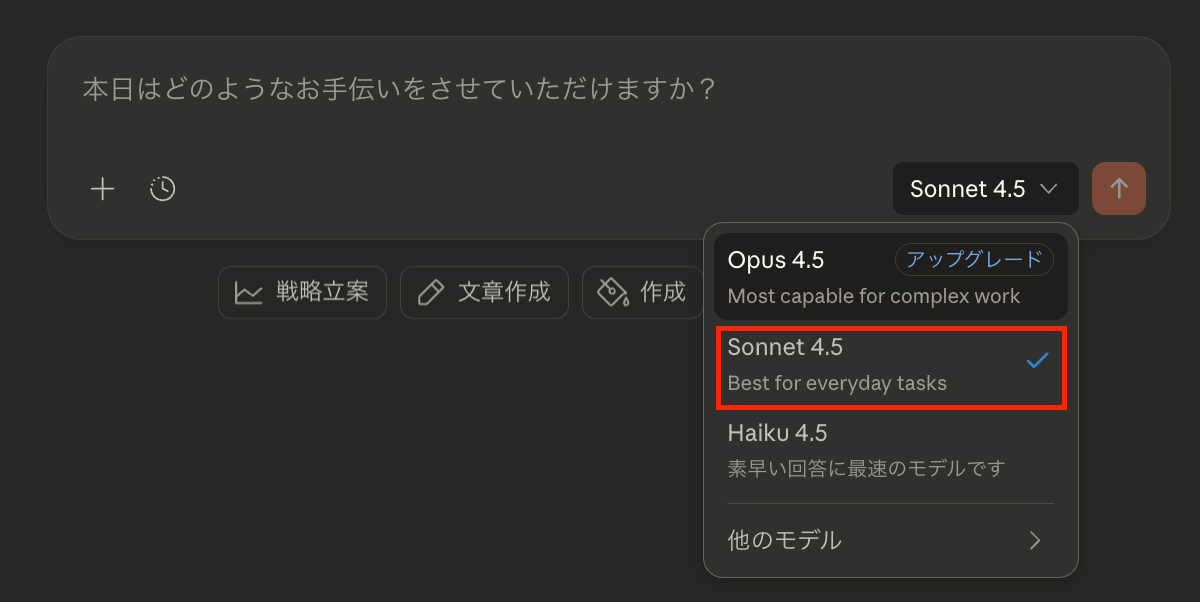 Claudeを開き、使用モデルを「Sonnet 4.5」に設定します
