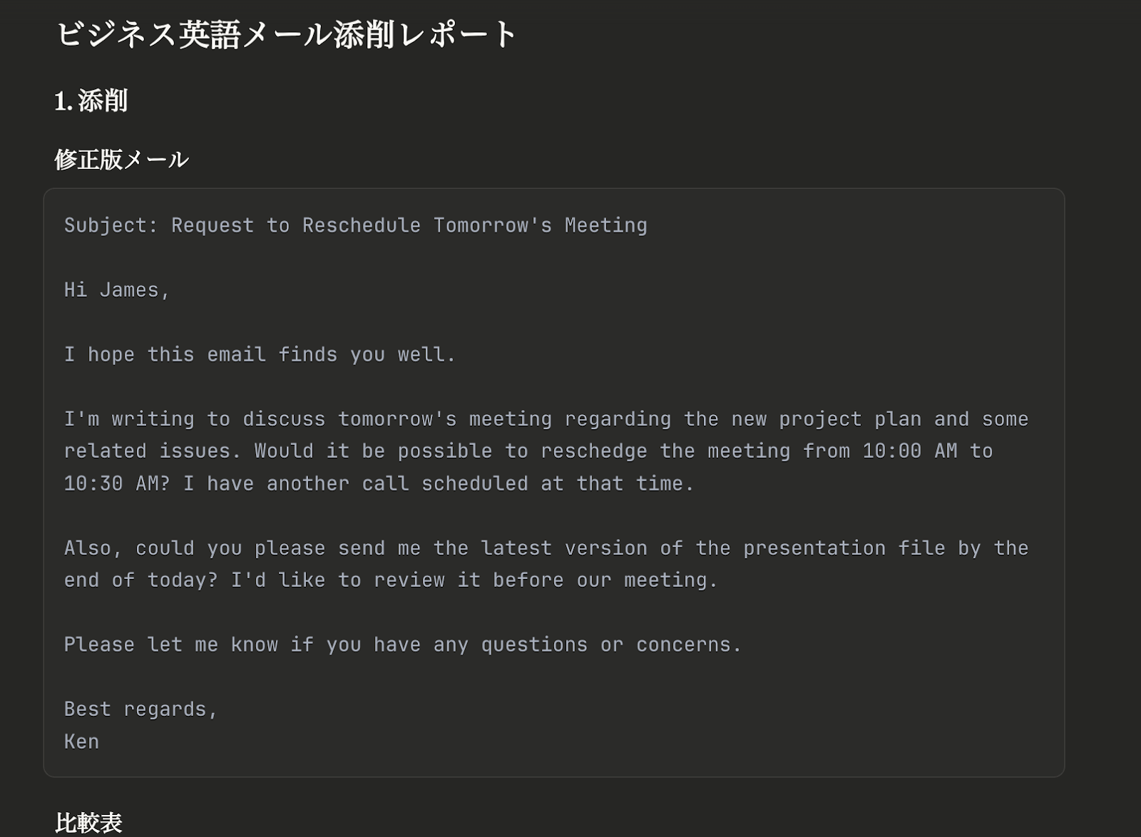 - 文法・語法・ビジネスとして自然なトーンに直した「修正版メール」を最初に提示してください。