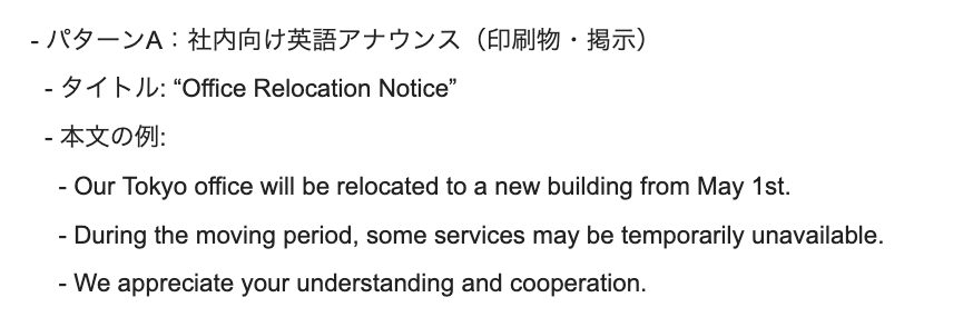 - 社内通知でよく使われる表現(例:will be relocated, temporarily unavailable, appreciate your understanding and cooperation など)を3〜5個ピックアップし、
