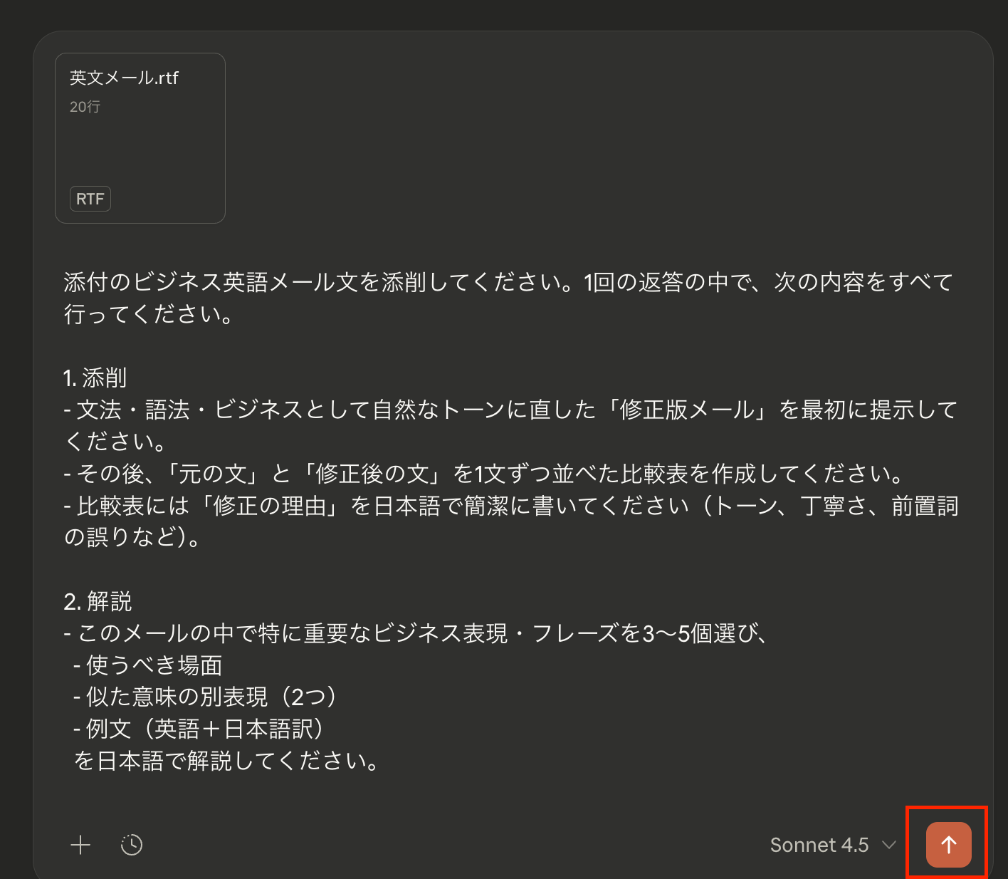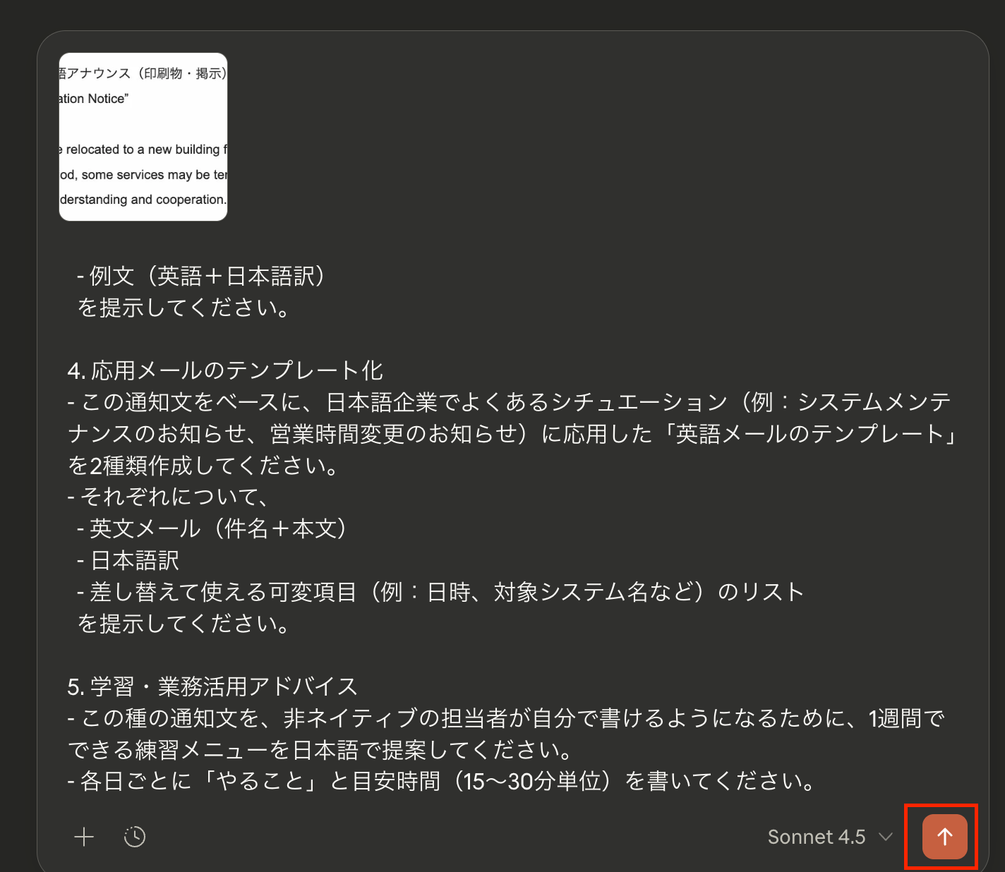 プロンプト(指示内容)をチャット欄に入力し、検証用に用意しておいたビジネスメールのテキストメモを添付して送信します。