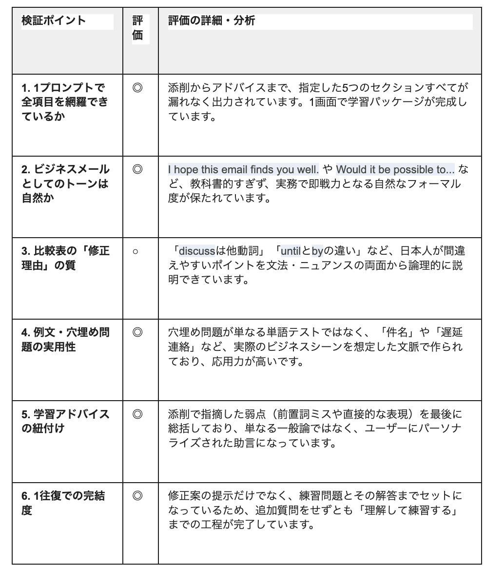 まずは、ビジネスメールを基に、「添削・解説・練習問題の作成」を1つのプロンプトで完結できるのかを検証してみます。