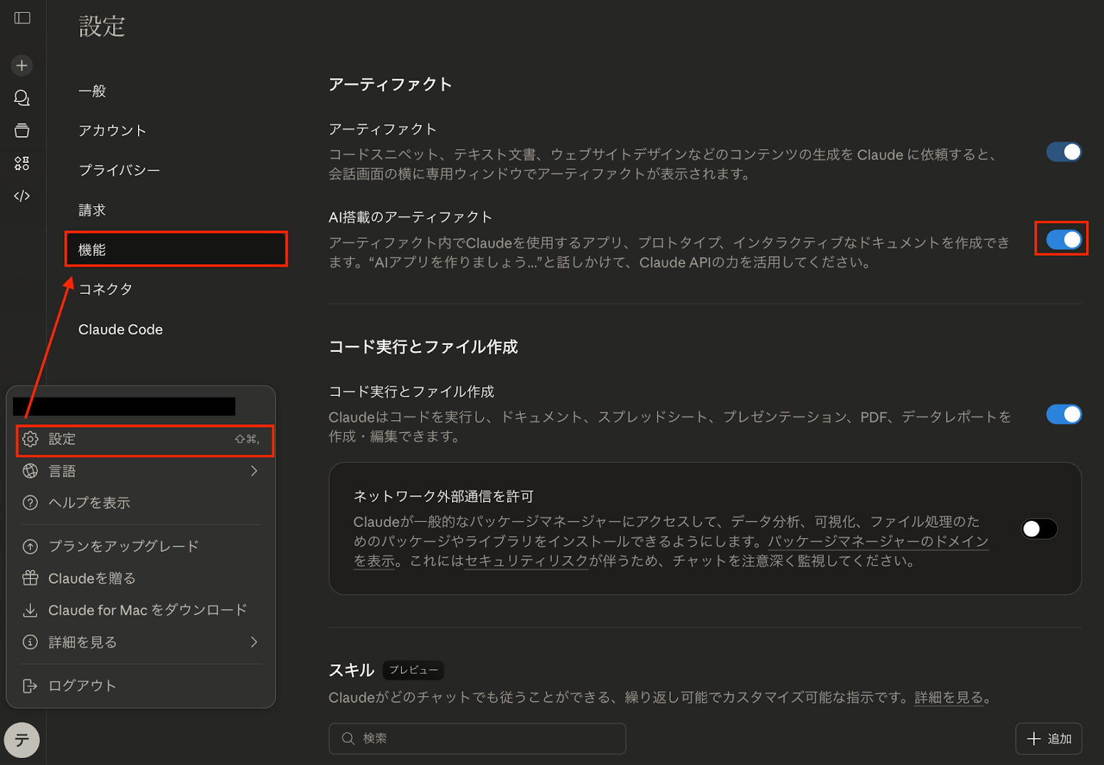 「設定」>「機能」と進み、「AI搭載のアーティファクト」のトグルをONにします。