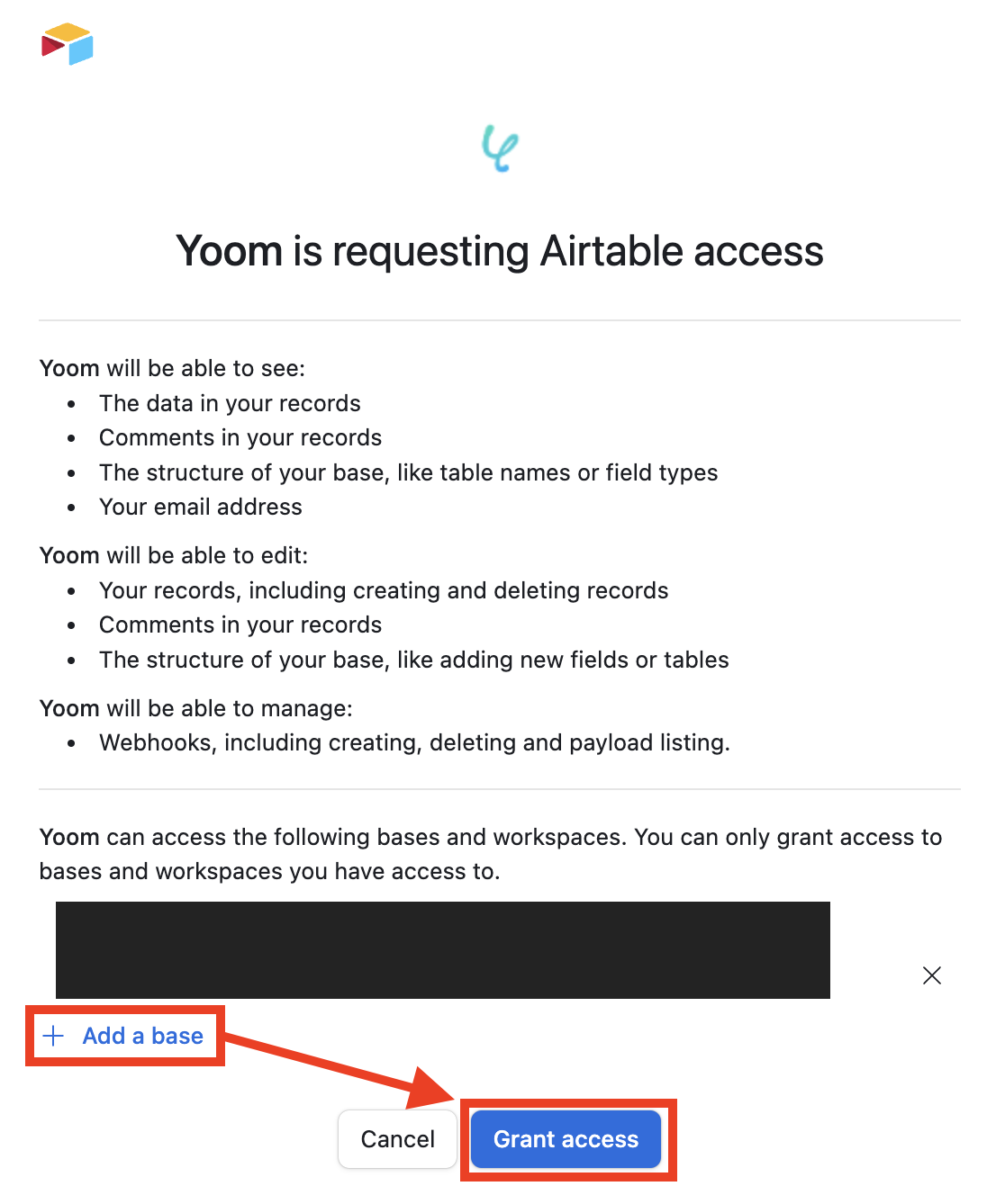 上記画面が表示されたら、「+ Add a base」から連携するワークスペースを選択し、「Grant access」をクリックしてください。