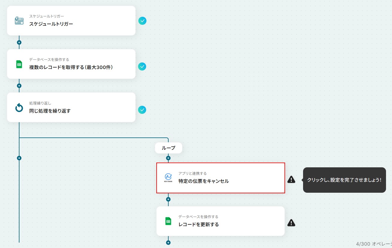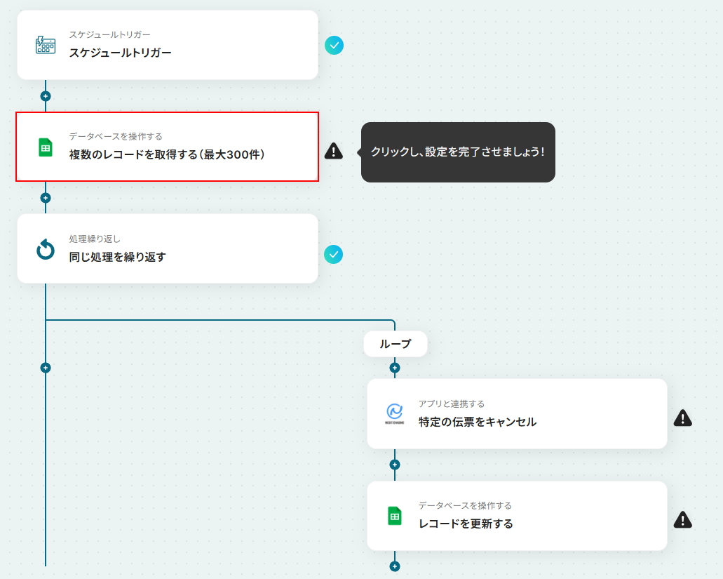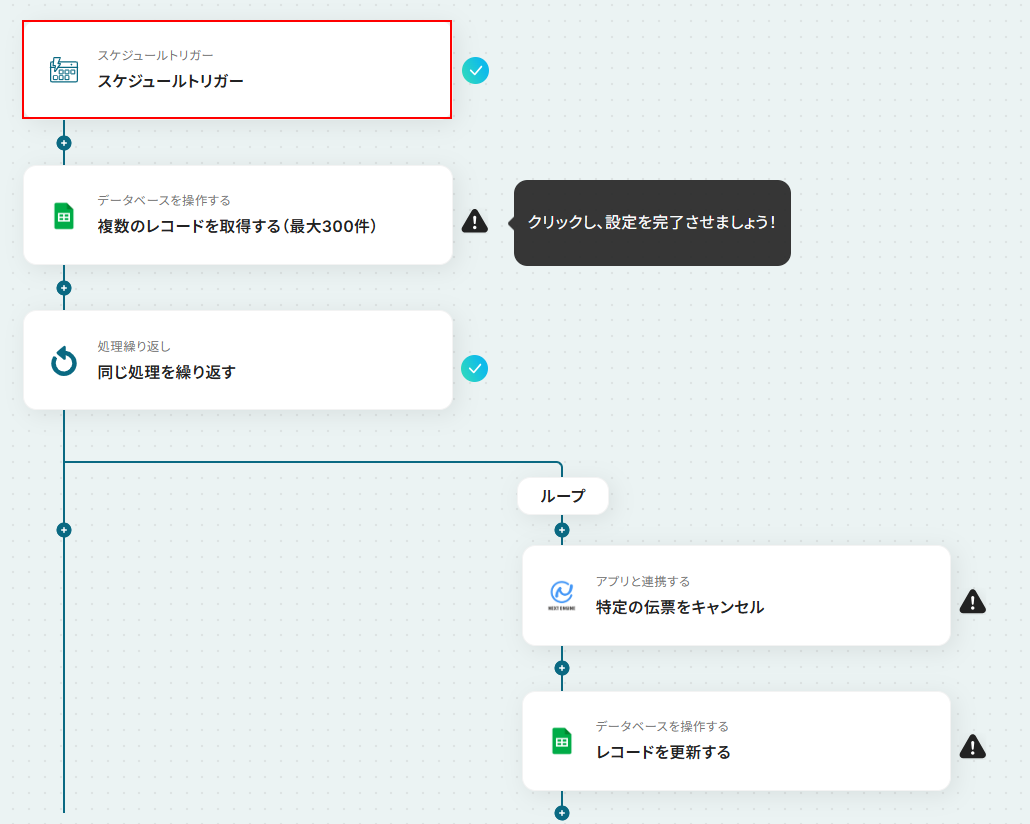 はじめに、Google スプレッドシートとNEXT ENGINEをYoomと連携します。 次に、トリガーでスケジュールトリガーを選択し、ワークフローを起動したい任意のタイミングを設定します。 次に、オペレーションでGoogle スプレッドシートの「複数のレコードを取得する」アクションを設定し、キャンセル対象の伝票情報を取得します。 次に、繰り返し機能を使って、取得した伝票情報1件ずつに対して後続の処理を実行するように設定します。 繰り返し処理の中で、NEXT ENGINEの「特定の伝票をキャンセル」アクションを設定します。 最後に、Google スプレッドシートの「レコードを更新する」アクションで、キャンセル処理が完了したことを示すステータスなどを書き込みます。 ※「トリガー」:フロー起動のきっかけとなるアクション、「オペレーション」:トリガー起動後、フロー内で処理を行うアクション■このワークフローのカスタムポイント