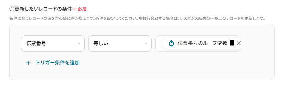 更新したいレコードの条件を設定します。 今回は以下のように取得した値の伝票番号のループ変数を利用し、キャンセルした伝票のレコードを更新できるように設定しました。 ご自身の状況に合わせて設定を行ってください。