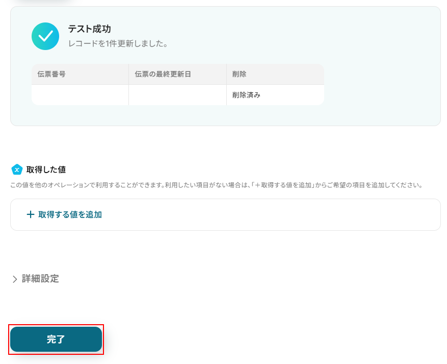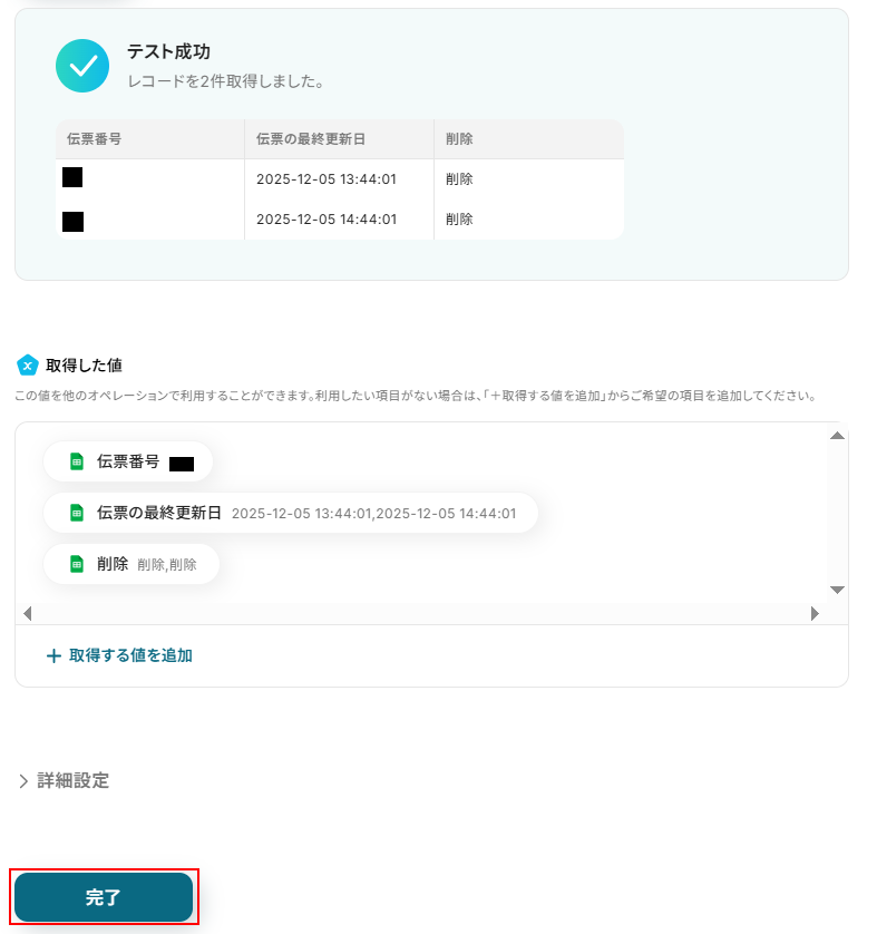 同じ処理を繰り返す設定では、先ほど複数取得したデータをそれぞれ個別に利用できるように処理を行います。 今回は以下のようにデフォルトで設定されている伝票番号と伝票の最終更新日をそのまま使用します。 使用したいデータを追加したい場合は+取得した値を追加をクリックし、設定を行ってください。 使用したいデータが設定されているのを確認したら完了 をクリックしましょう。