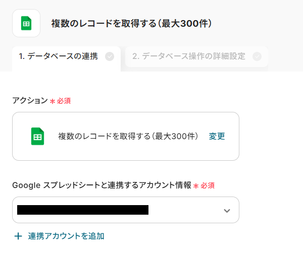 複数のレコードを取得する(最大300件) をクリックします。 あわせて【Google スプレッドシート】データベースを操作するオペレーションについて もご確認ください。