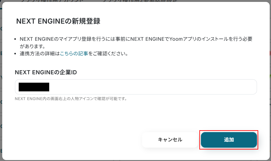 注釈を確認しながらNEXT ENGINEの企業IDを入力します。 入力できたら追加 をクリックしましょう。