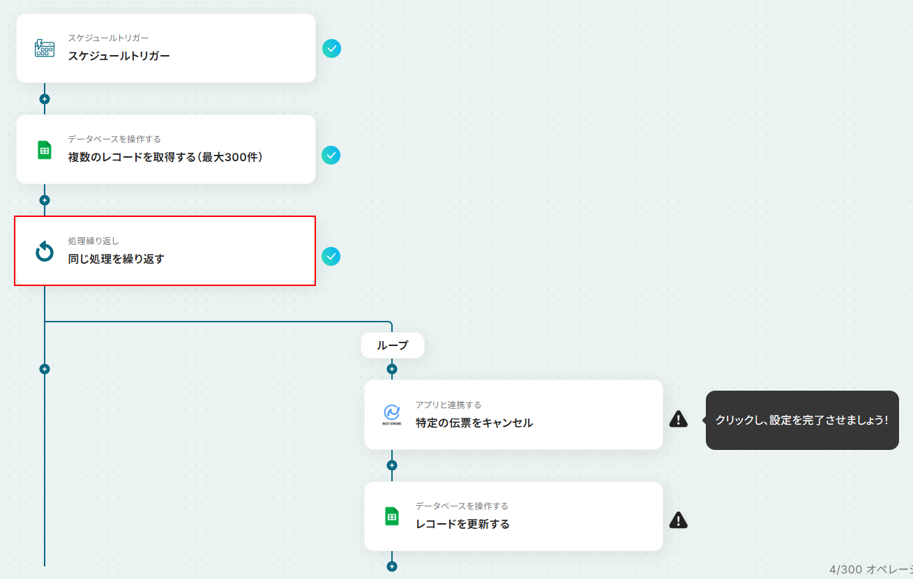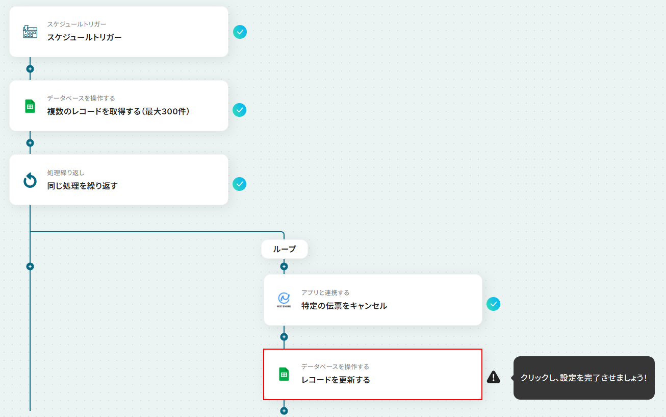 お疲れ様でした!ここまでで設定は完了です! 以上が定期的にGoogle スプレッドシートからキャンセル対象の伝票情報を取得し、NEXT ENGINEで一括キャンセル処理を実行する フローでした!