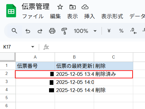 Google スプレッドシートのレコードが更新されていますのでご確認ください。 ※今回はテストのため、削除されるレコードは1件ですが、実際にフローを動かすと取得した件数分のレコードが削除され、削除済みに更新ます。