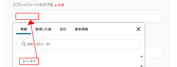 スプレッドシートのタブ名を設定します。 入力欄をクリックし、伝票のデータを入力しているスプレッドシートのタブ名を選択してください。